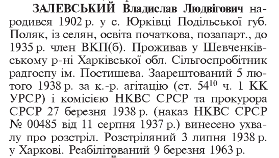Владислав Залевський розстріляний 03.07.1938 р. у м. Харків.