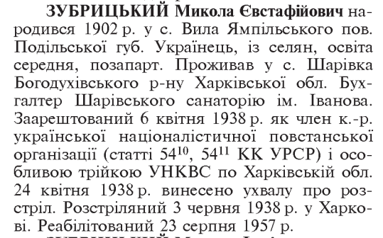 Микола Зубрицький розстріляний 03.06.1938 р. у м. Харків.