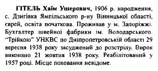 Хаїм Гітель розстріляний 21.10.1938 р. Місце поховання невідоме.