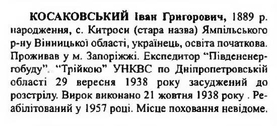 Іван Косаковський розстріляний 21.10.1938 р. Місце поховання невідоме.