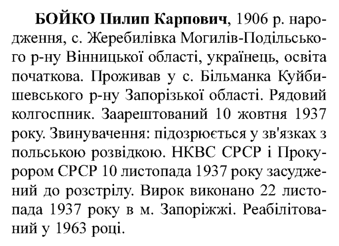 Пилип Бойко розстріляний 22.11.1937 р. у м. Запоріжжя
