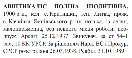 Соціальне походження: із селянОсвіта: малописьменнаПартійність: н/дПрофесія (місце роботи): без певного місця роботиСімейний стан: незаміжняЗаарештована: 25.12.1937Звинувачення: ст. 54-1 "а", 54-10 КК УССРНаркомом ВС СССР і прокурором СССР ("двійкою") засуджена до розстрілуДата вироку: н/дПоліна Авштикаліс розстріляна 26.03.1938 р.Реабілітована: 31.10.1989 р.